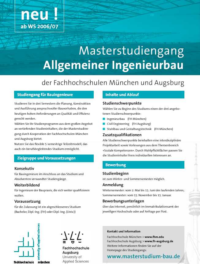 Das Bayerische Staatsministerium für Wissenschaft, Forschung und Kunst hat mit Schreiben vom 10.7.2006 sein Einvernehmen zur Einführung des Masterstudiengangs "Allgemeiner Ingenieurbau" erklärt. Als Abschlußgrad wurde der "Master of Engineering" (M.Eng.) festgelegt.